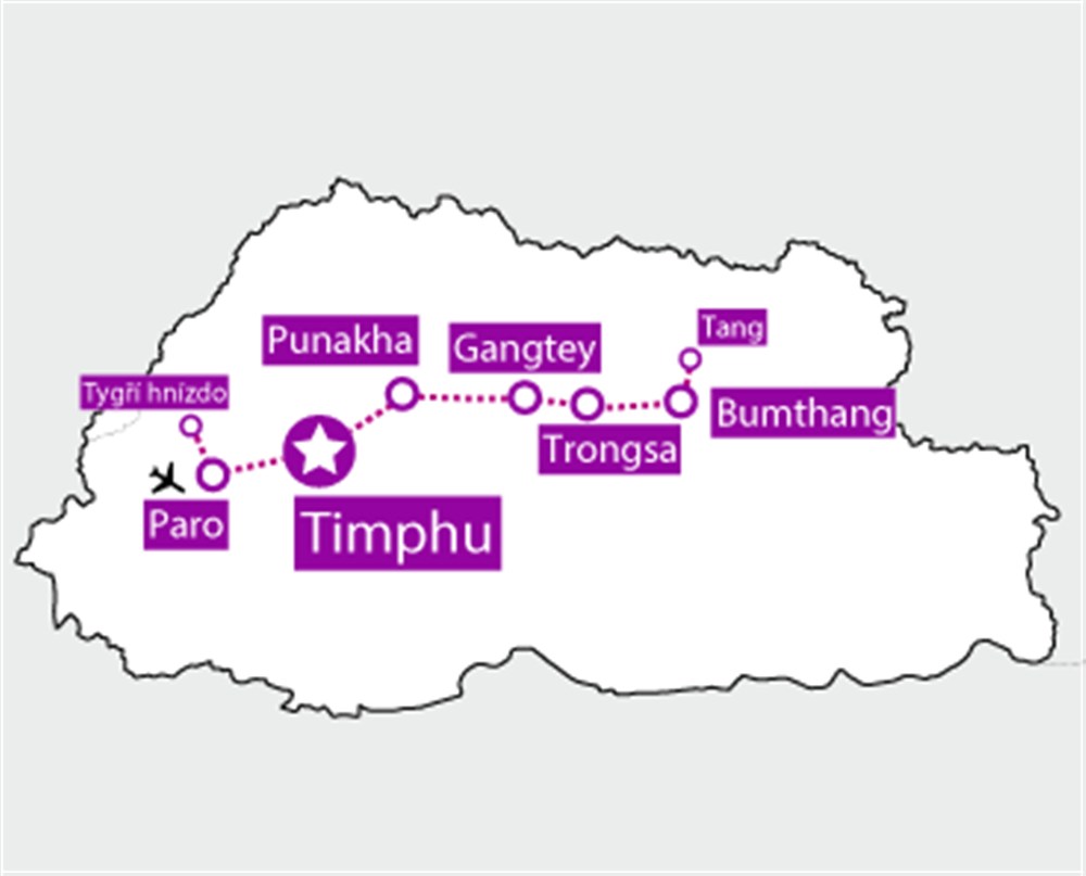 Podnikneme pěší výstup (cca 5 hodin) k legendárnímu klášteru Taktshang („Tygří hnízdo“) na útesu 900 m nad údolím. Toto posvátné místo je symbolem celé země. Nocleh v Paro.
