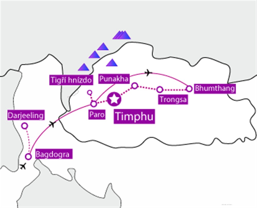 Čeká vás přelet nad majestátními sněhem pokrytými vrcholky Himálaje do "Země hřmícího draka" a jak se budete blížit k údolí Paro, budete přelétat a míjet zalesněné kopce, se stříbřitou řekou Paro (Paro Chu) klikatící se dole v údolí, zahlédnete pevnost Paro Dzong a rozhlednu Ta Dzong (Dzong, slovo se kterým se budete při vaší cestě setkávat velmi často, je název pro specifickou stavbu sloužící jako pevnost a zároveň jako klášter buddhistických mnichů. Tyto stavby jsou známé z Himalájí, jižního Tibetu a zejména Bhútánu. Objekty jsou rozlehlé a sestávají se mnoha nádvoří, chrámů, administrativních budov a ubytoven pro mnichy).