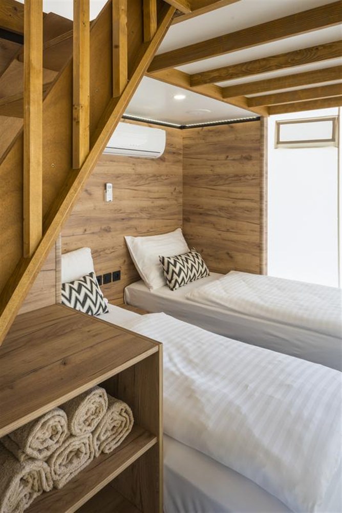 - Mobilní domy Cozy Home: cca 30 m2, pro max. 3 osoby. Manželské dvoulůžko, kombinovaný obývací pokoj s ambientním osvětlením, TV, bluetooth systém s vestavěnými stropními reproduktory, kuchyňský kout a rozkládací pohovka vhodná pro 1 dítě, samostatná koupelna a venkovní terasa.