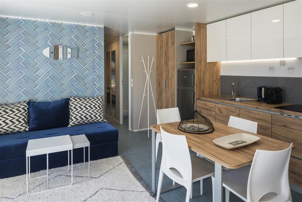 - Mobilní domy Family Home: cca 45 m2, pro max. 5 osob. 2 ložnice (1x dvoulůžko a 1x oddělené postele), kuchyňský kout (sporák, lednice, dřez a myčka nádobí), rozkládací pohovka vhodná pro 1 dítě, 2 samostatné koupelny (s WC, sprchou a umyvadlem), TV a venkovní terasa.