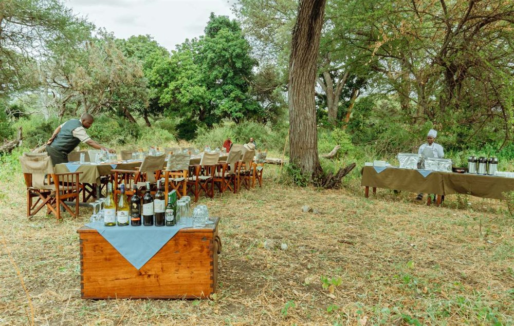Součástí zážitku je také večerní posezení u táborového ohně („bush TV“) s výhledem do krajiny Tarangire. Atmosféra stolování podtrhuje celkový safari charakter lodge
