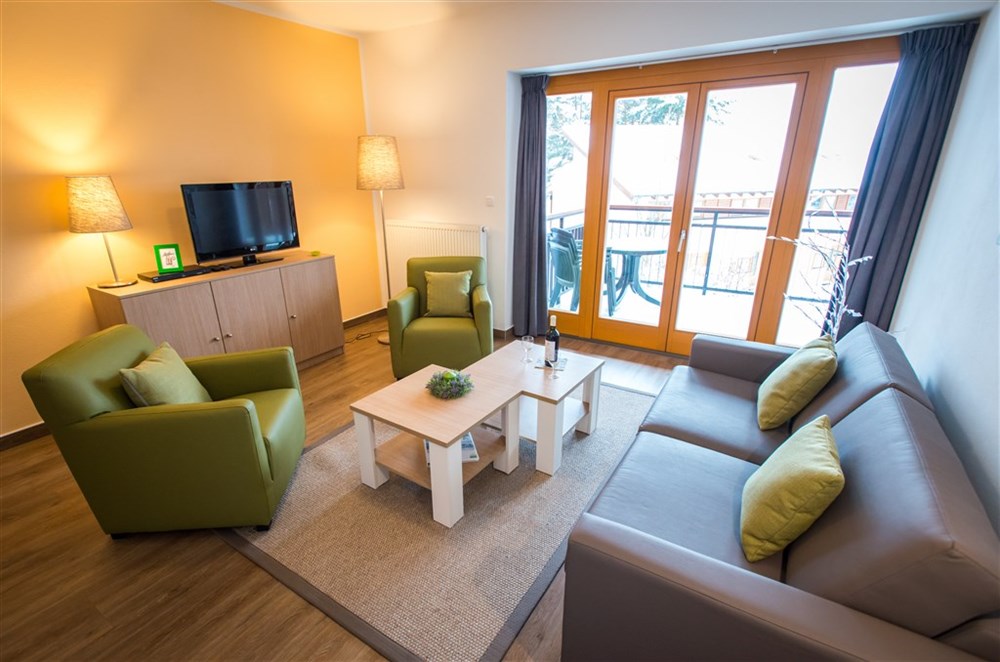 - Apartmány 3+kk pro až 6 osob: cca 74-84 m2. Apartmán se dvěma ložnicemi, obývacím pokojem s rozkládacím gaučem, kuchyňským koutem, koupelnou, odděleným WC. Přízemní apartmá s balkonem nebo terasou.
