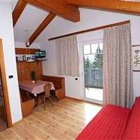 - Apartmány Mono: cca 27 m2, pro až 4 osoby. Obývací ložnice s rozkládací pohovkou a palandou, balkon nebo terasa.