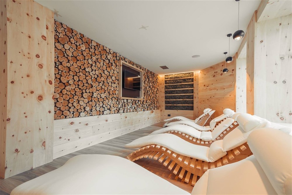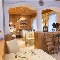 - Junior Suite: cca 35 m², ložnice s manželským dvoulůžkem, obývací část s krbem a se 2 samostatnými lůžky oddělená posuvnými dveřmi, navíc minibar (za poplatek) a varná konvice. Panoramatický výhled na Dolomity.