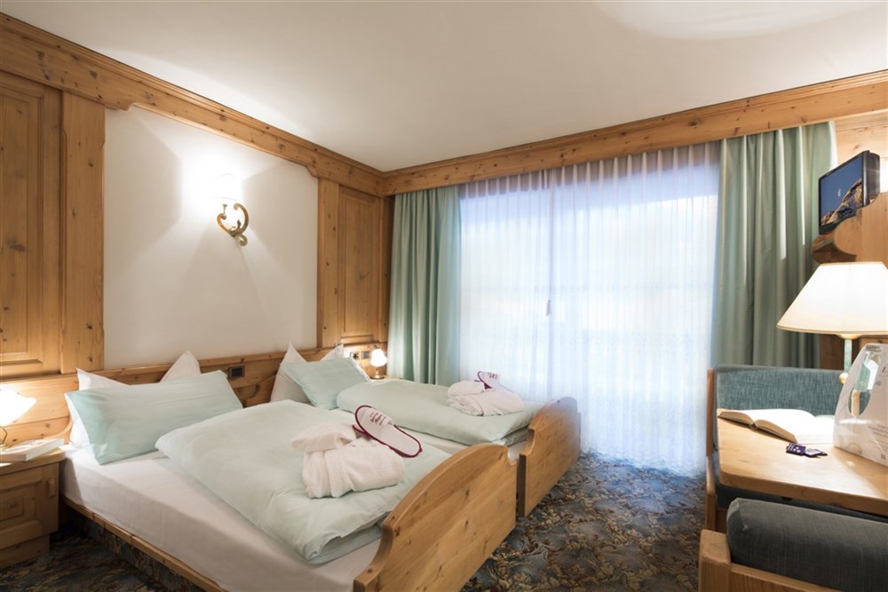 - Dvoulůžkové pokoje Superior: cca 20 m², možnost jedné přistýlky. Orientace na čelní stranu hotelu (výhled na Dolomity).