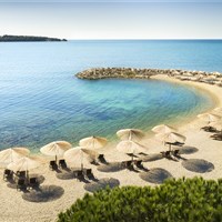 Pláž: oblázková, cca 50 m. Na pláži jsou sprchy zdarma a lehátka a slunečníky za poplatek. Na pláži jsou restaurace a bary.