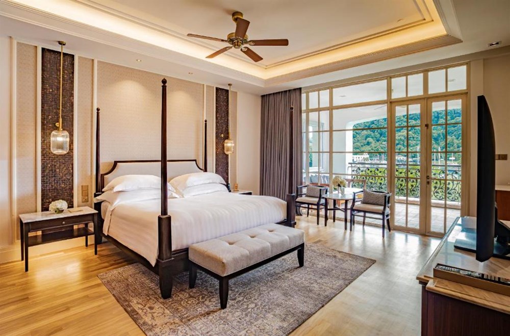 Merchant Room (60 m²) – světlý, elegantní pokoj s balkonem, mramorovou koupelnou a výhledem do zeleně nebo na přístav.