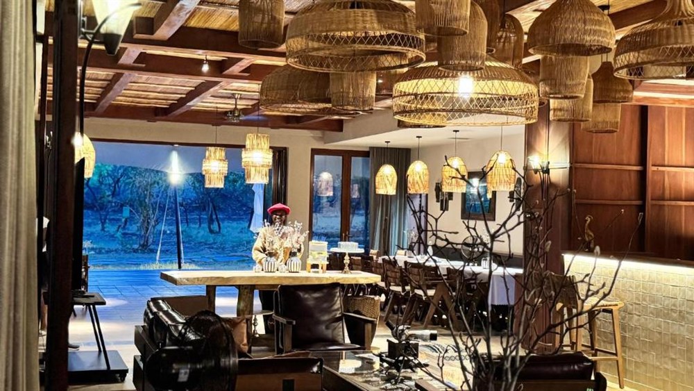 Součástí lodge je elegantní restaurace s venkovní terasou, která nabízí místní i mezinárodní kuchyni připravovanou z čerstvých surovin. Hosté si mohou vychutnat snídani, tříchodové večeře nebo grilování pod africkou oblohou. Bar s panoramatickou verandou podává výběr vín, koktejlů a osvěžujících nápojů. V okolí lodge nejsou další restaurace – stravování probíhá výhradně v rámci resortu.