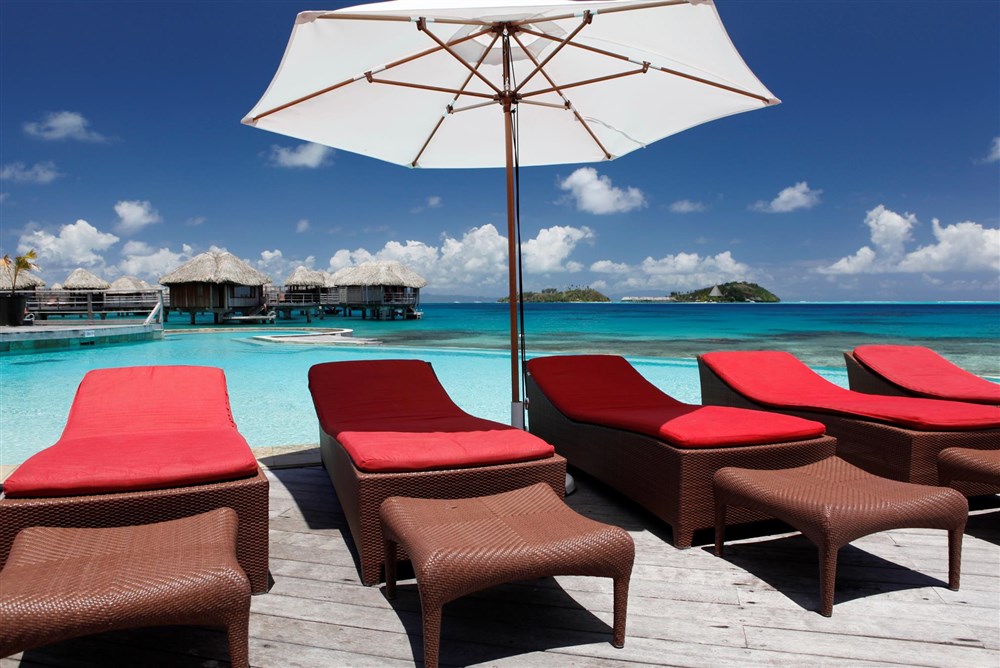 Luxusní vodní vilky s výhledem na lagunu ostrova Bora Bora. Součástí je prosklená podlaha pro pozorování života pod vodou i žebřík pro přímý vstup do laguny.